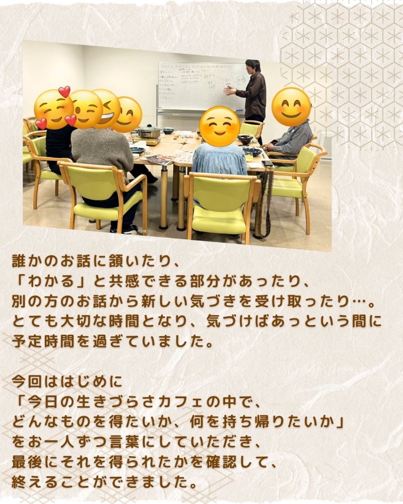 お一人おひとりから、普段は家族や身近な人にはなかなか言えない気持ち、ここだからこそ出せる本音や弱音、葛藤などもご自身のペースでお話しいただきました。