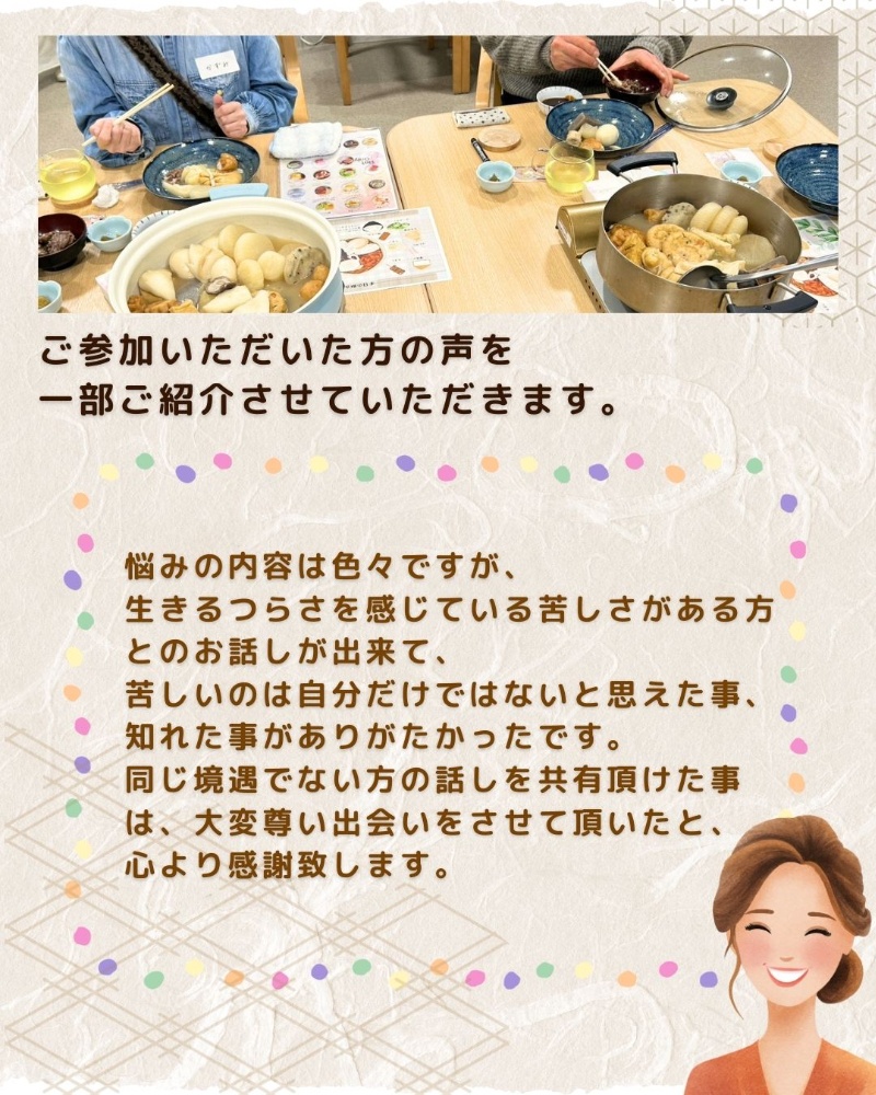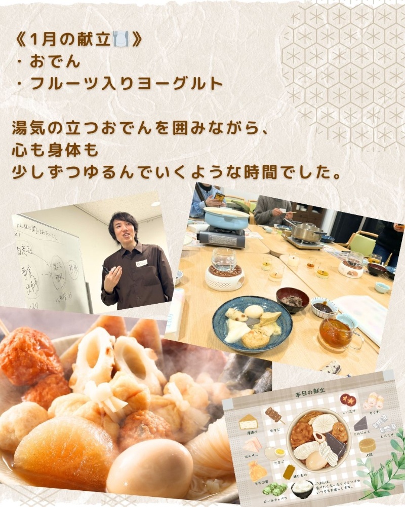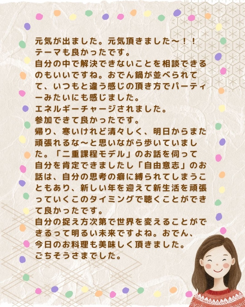 ファシリテターのお二人より、「二重課程」のお話を伺って自分を肯定できましたし、「自由意志」のお話は、自分の思考の癖に縛られてしまうこともあり、新しい年を迎えて新生活を頑張っていくこのタイミングで聴くことができて良かったです。自分の捉え方次第で世界を変えることができるって明るい未来ですよね。おでん、今日のお料理も美味しく頂きました。ごちそうさまでした。
