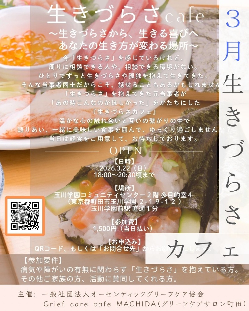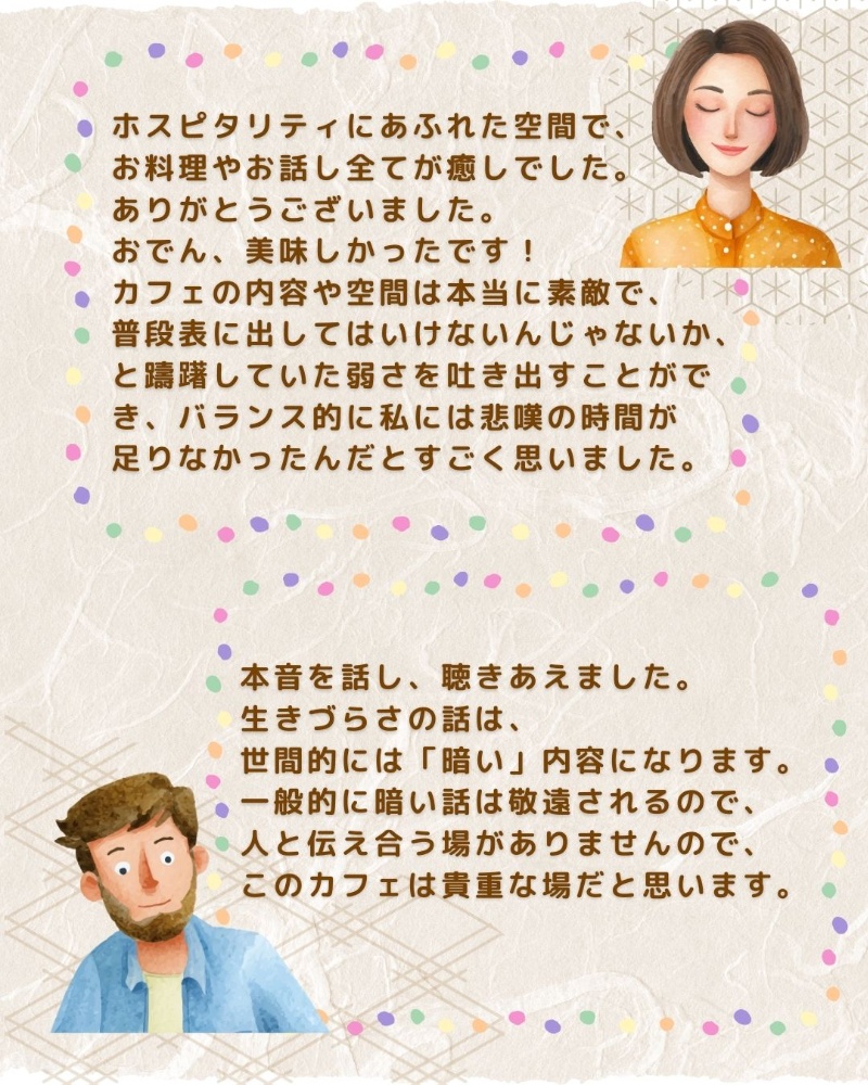 一般的に暗い話は敬遠されるので、人と伝え合う場がありませんので、このカフェは貴重な場だと思います。