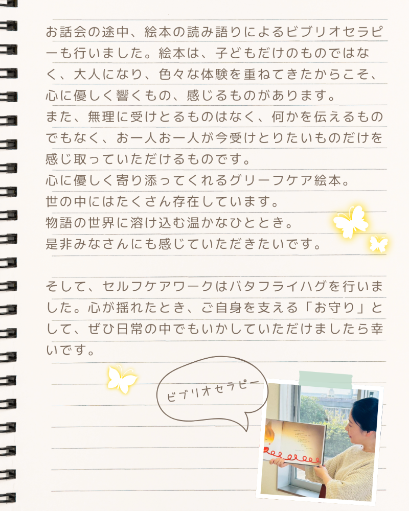 そして、セルフケアワークはバタフライハグを行いました。心が揺れたとき、ご自身を支える「お守り」として、ぜひ日常の中でもいかしていただけましたら幸いです。