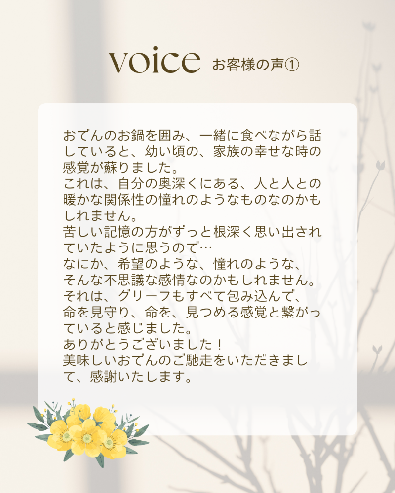 ◎おでんのお鍋を囲み、一緒に食べながら話していると、幼い頃の、家族の幸せな時の感覚が蘇りました。