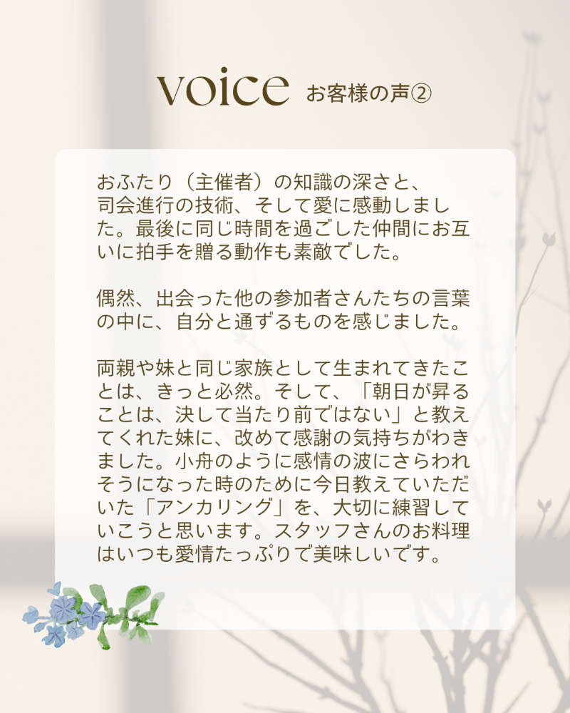 両親や妹と同じ家族として生まれてきたことは、きっと必然。そして、「朝日が昇ることは、決して当たり前ではない」と教えてくれた妹に、改めて感謝の気持ちがわきました。小舟のように感情の波にさらわれそうになった時のために今日教えていただいた「アンカリング」を、大切に練習していこうと思います。スタッフさんのお料理はいつも愛情たっぷりで美味しいです。