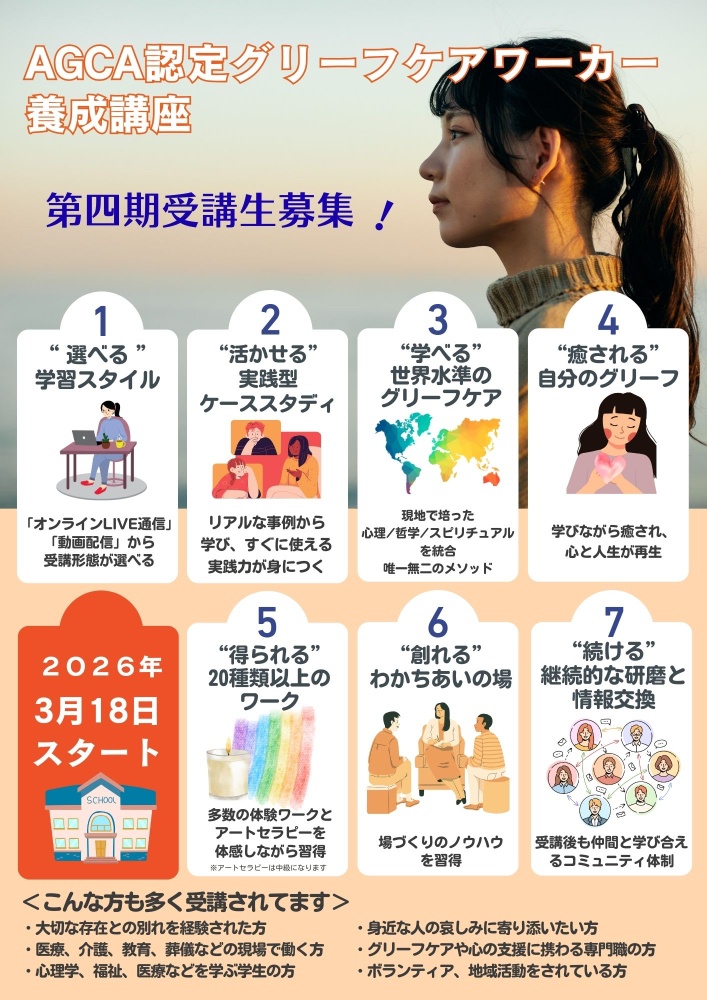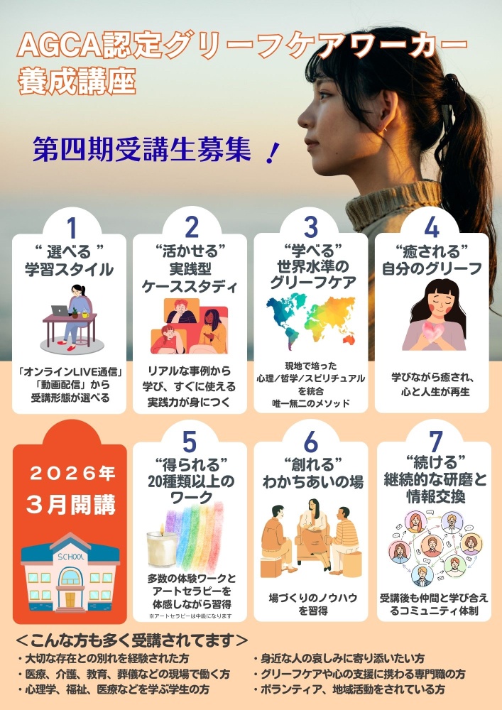| スクール 資格取得講座 | ◇オンライン形式(Zoomを使用) ◇内容 【初級】AGCA認定グリーフケアワーカー養成講座 【中級】AGCA認定グリーフケアマイスター養成講座 【上級】AGCA認定グリーフケアメンター養成講座 ※資格取得講座につきましては、オーセンティックグリーフケア協会のホームページよりご確認いただけます。 |